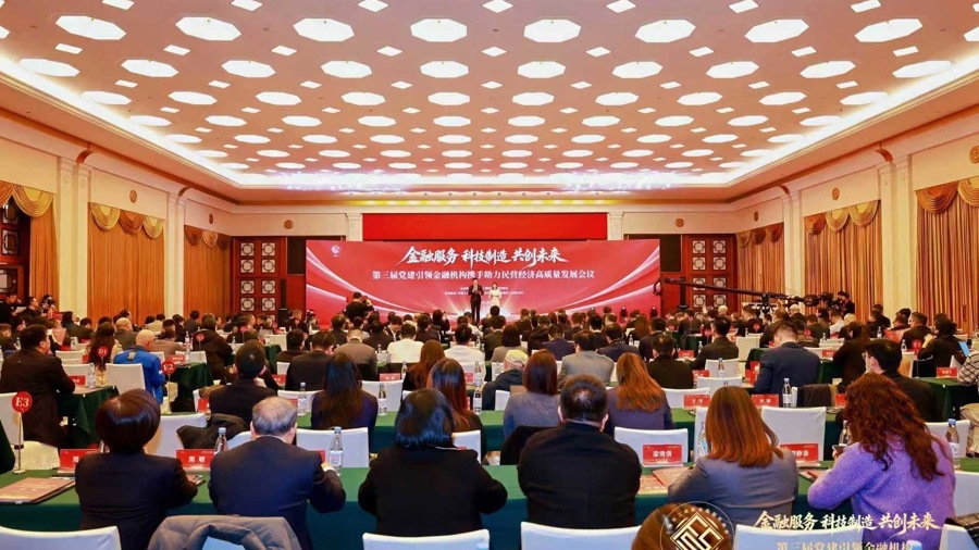 由上海市工商联直属金融服务商会主办的“第三届党建引领金融机构携手助力民营经济高质量发展会议”今天在上海展览中心友谊会堂举行,以“金融服务 科技制造 共创未来”为主题,旨在汇聚金融力量服务实体经济,推动上海民营经济高质量发展迈向更高水平。